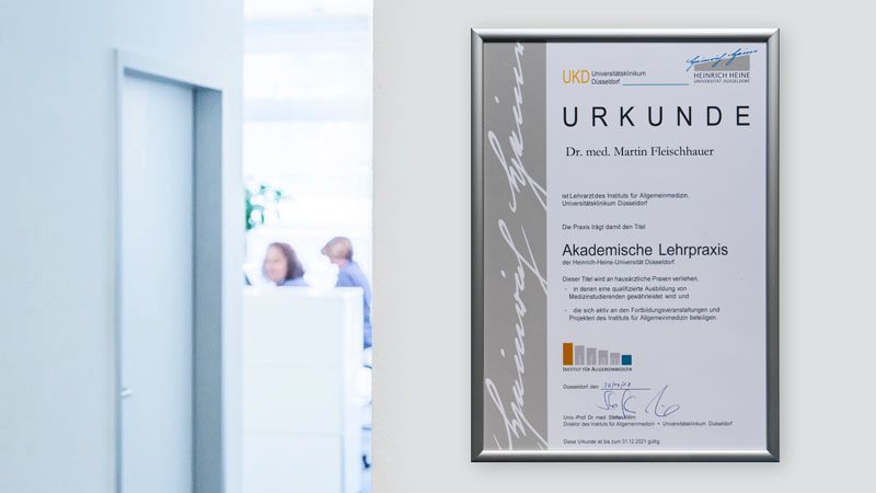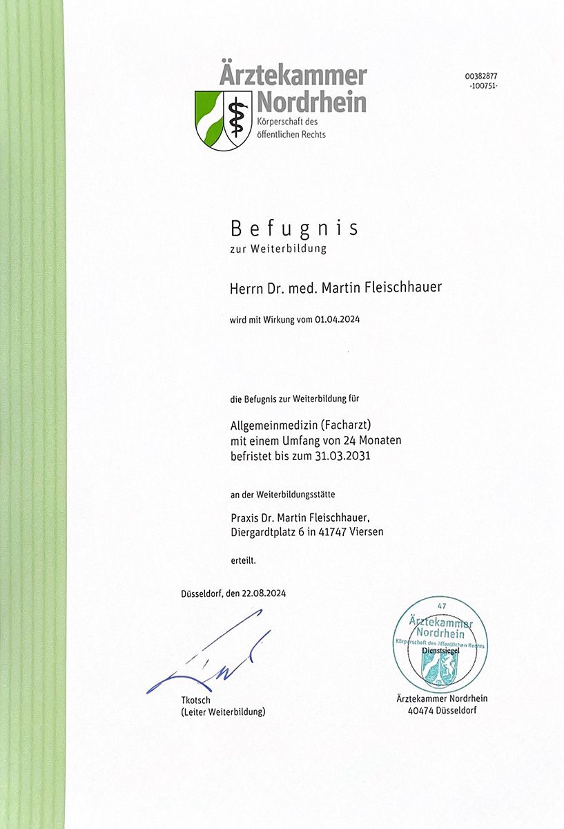 Medizinstudenten der HHU Düsseldorf haben die Möglichkeit im Rahmen des Praktikums alle Facetten der all­gemein­medi­zinischen Praxis hier bei uns kennen­zulernen. Darüber hinaus hat Herr Dr. med. M. Fleischhauer als Facharzt die Befugnis zur Weiterbildung im Facharzt für Allge­mein­medizin (Umfang von 24 Monaten).